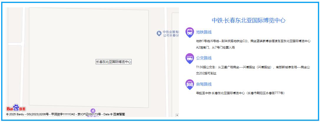 自驾路线:导航至中铁·长春东北亚国际博览中心(长春市朝阳区永春街777号)。